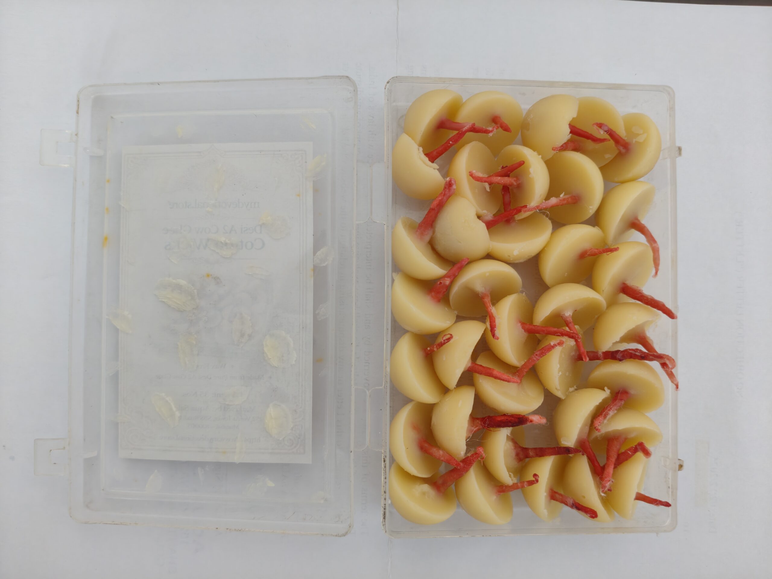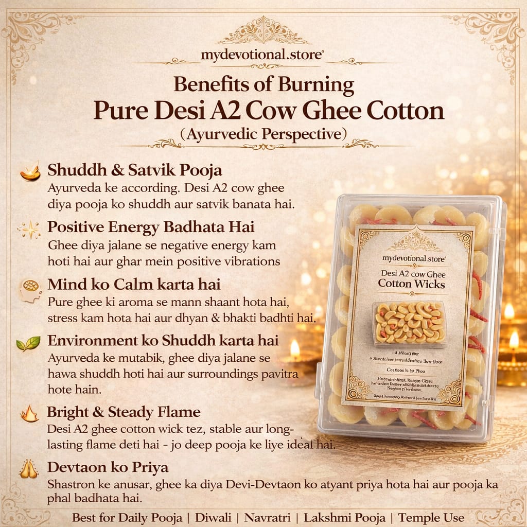 Mydevotional.store brings to you pure desi A2 cow ghee cotton wicks. Using pure desi A2 cow ghee in cotton Wicks (diyas) purifies the air , invite positive energy and offers therapeutic benefits through its aroma, creating a calming and spiritually uplifting environment.