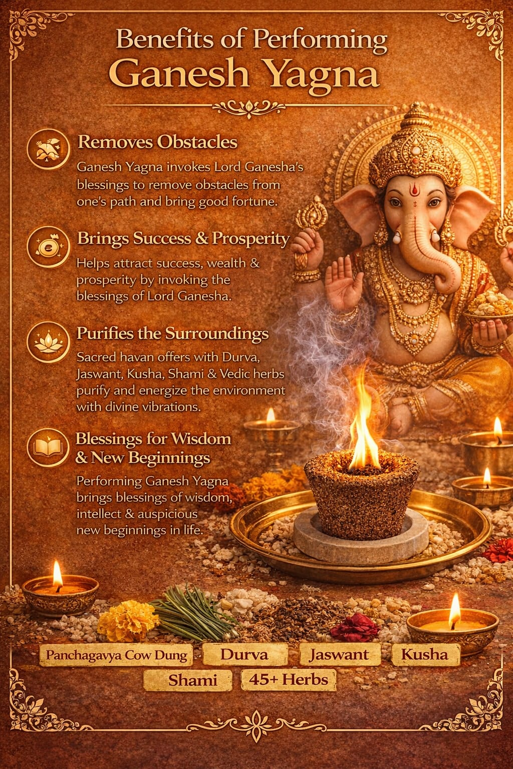 Ganesh Yagna is a Hindu ritual and ceremony performed for removing obstacles (Vighnaharta), bringing Wisdom, intelligence, success, and prosperity while also purifying negative energies, enhancing focus, granting peace, and ensuring over well-being and spiritual growth. It helps overcome repeated failures, relationship issues, and planetary afflictions (doshas) by invoking divine protection and blessings for new beginnings and success.