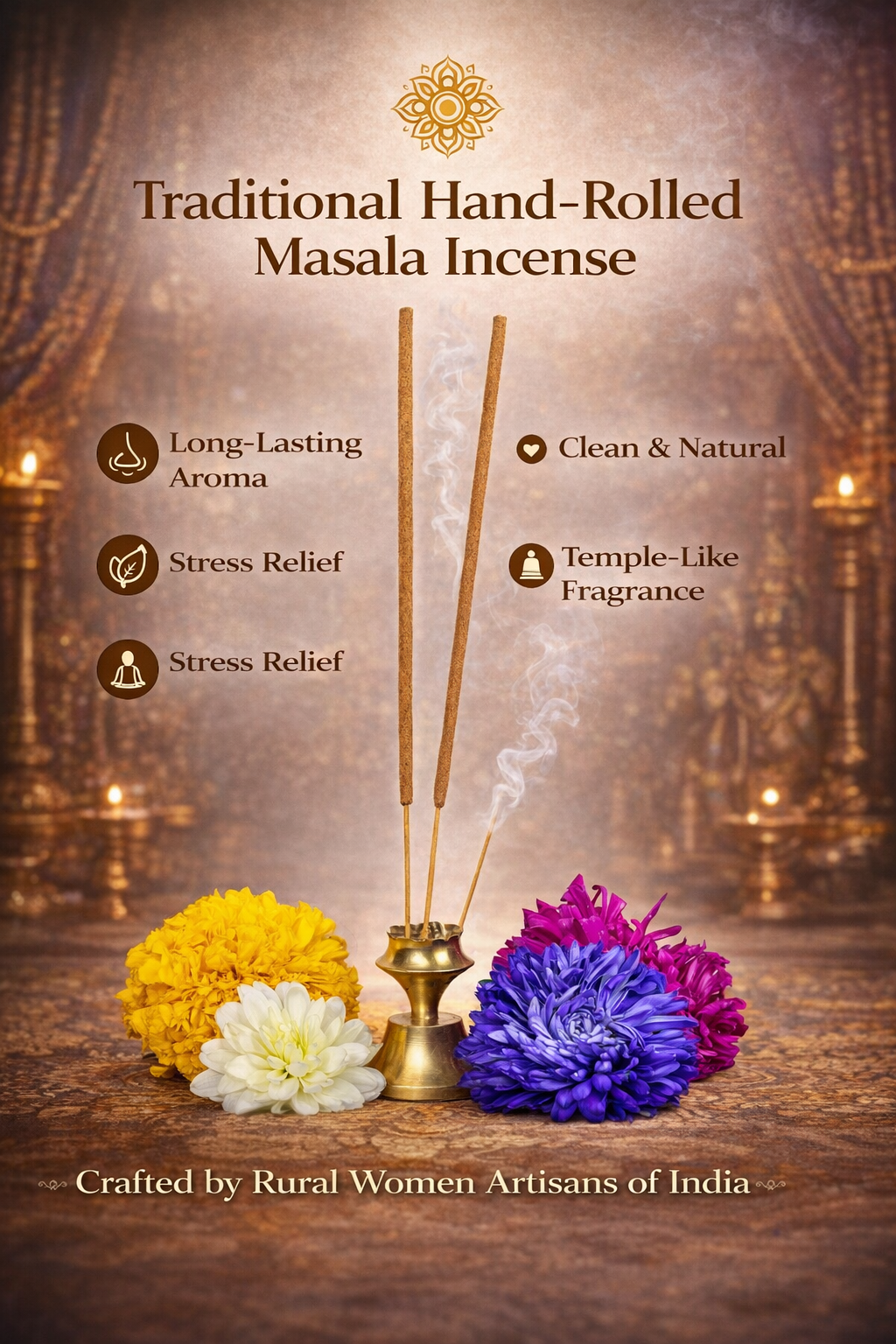 Indulge in the purity of traditional fragrance with our Hand-Rolled Masala Incense Sticks, Hand crafted by the women Artisens of rural India with devotion using natural herbs, aromatic oils and resins. Each stick is made using traditional masala rolling techniques that deliver a deep, calming and long lasting aroma.